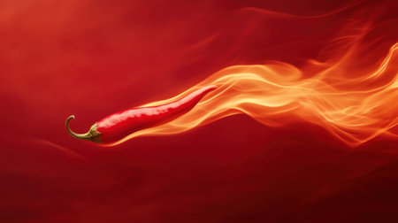 A stunning image of a vibrant red chili pepper soaring through dynamic flames, creating a captivating visual against a rich red background, embodying heat and spice.