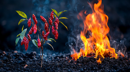 Fiery Red Chili Peppers Plant Near Burning Embers Dramatic Nature Photography Art Fire Food Heat