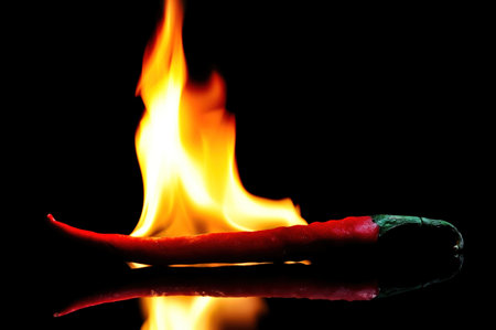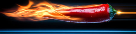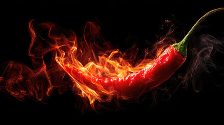 A fiery red chili pepper set ablaze, capturing the essence of spicy culinary heat
