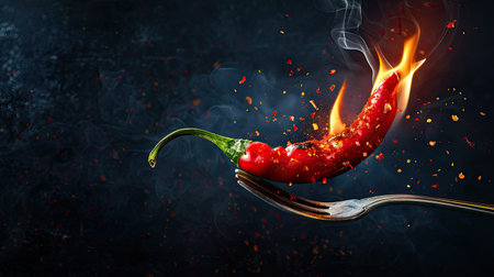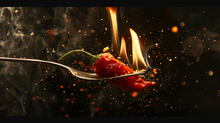 Vibrant red hot pepper skewered on a fork, flames engulfing it, set against a stark black background for intense culinary themes.