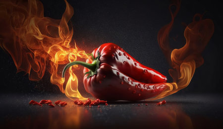 AI Generated. Fiery Red Chili Pepper with Flames on Dark Background