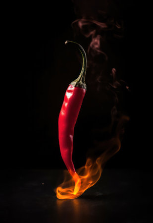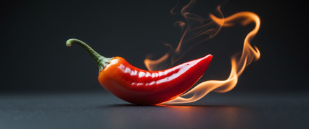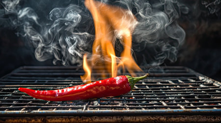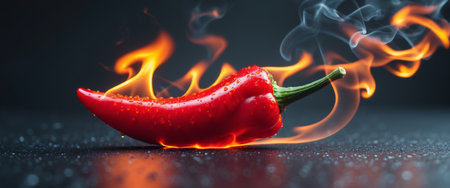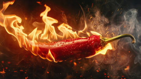 A vivid red chili pepper emits smoke and flame against a dark background, capturing the essence of heat and spice in culinary art. Perfect for food-related designs.