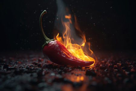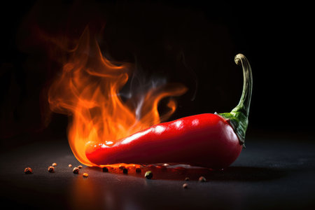 AI Generated. Fiery Red Chili Pepper Burning with Flames on Dark Surface