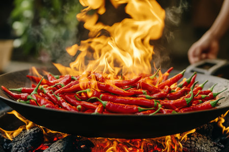 Fiery Red Chili Peppers on Fire Hot Spicy Food Cooking