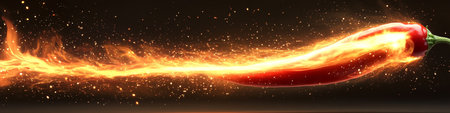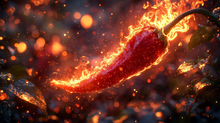 A vibrant image of a fiery chili pepper ablaze, surrounded by glowing sparks. the intense heat and vibrant colors capture the essence of spice and energy.