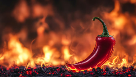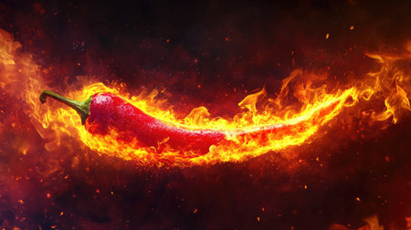 A vibrant chili pepper with flames rising around it, emphasizing the intensity of spicy cuisine and bold flavors.
