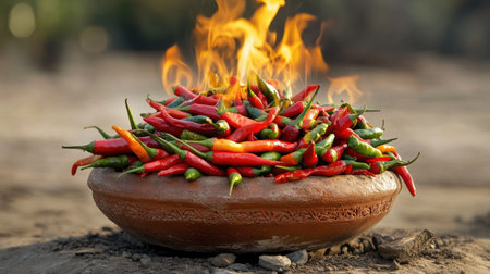 Flames erupting from a bunch of chili peppers packed tightly in a clay bowl, rustic and vivid