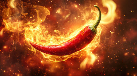 A stunning image of a red chili pepper surrounded by dynamic flames and spices, symbolizing culinary heat and intensity, perfect for culinary or spice-related projects.