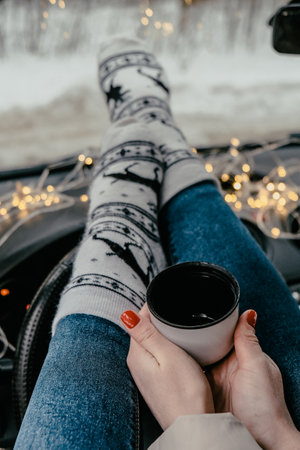 Woman legs with socks hand holding cup of coffee or tea in winter car. Christmas socks. Garland defocused lights. Winter travel.