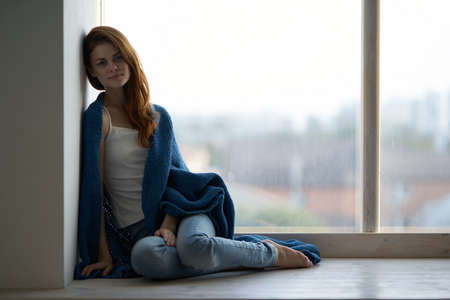 Beautiful woman in a sweater sitting home by the window. Blurred winter snow tree background. Morning, coziness, winter and people concept