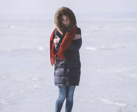 portrait of beautiful, young, sexy, cute, brunette woman, freezing in the cold winter in white coat and hood, lying surreal like standing on the frozen lake, surrounded by ice crystals, copy space