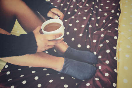 Woman legs in knee socks with notebook and cup of coffee on white bed at home