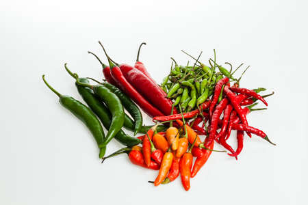 Top view some of the red chili or Jinda Chili in Thai language, close up image, arranged fresh chili as a pattern on white background.
