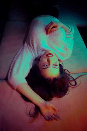 Top view of a beautiful girl sleeping cozily on a bed in her night room with colorful neon lights.