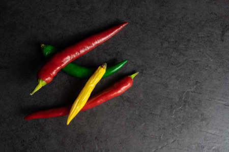 A group of fresh red, green, and yellow chili pepper on black background, copy space and top view