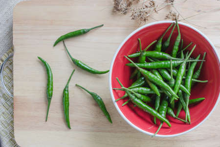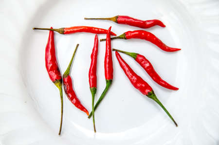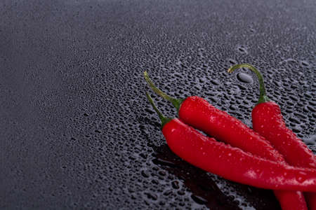 Bird peppers on wet black surface. Embarrassed chilis in the corner. Food concept.