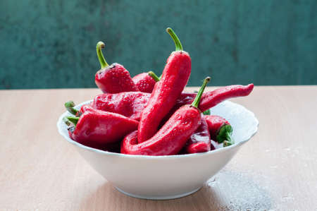 handful of chili peppers in white ceramic dish covered with drops on wooden table and grunge background