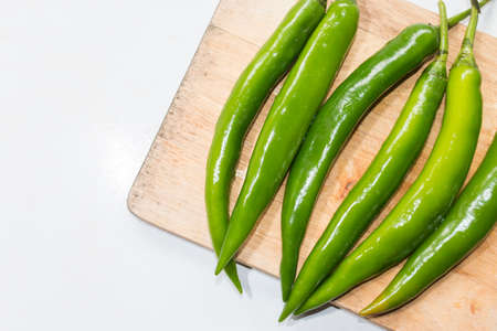 Top and perspective view of chili pepper and knife on a wooden cutting board with an isolated background