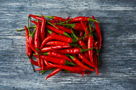 From above shot of layout of bright ripe red chili peppers arranged in row on rough wooden table