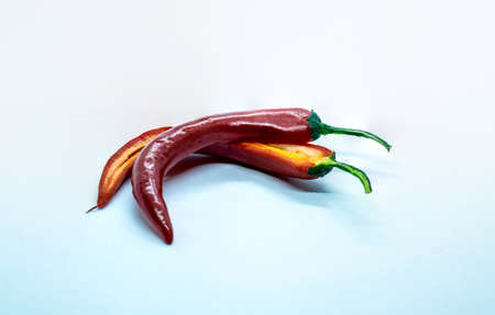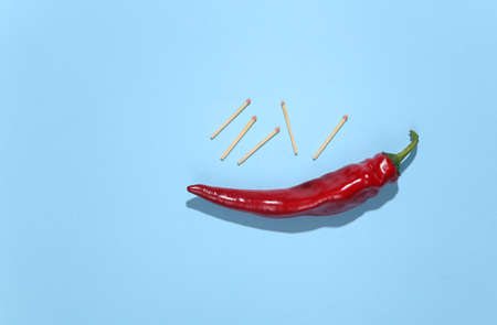 Very Hot Chili Peppers on Blue Paper Background Top View with Space for Text. Red Spicy Chilli Peppers Pattern or Backdrop for the Indian Menu for Oriental Food Design