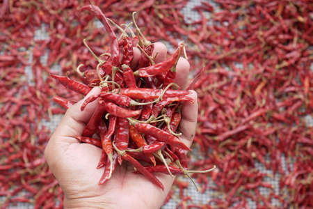 Dried chili peppers isolated on white background Arrange in a frame. Flat layout.