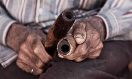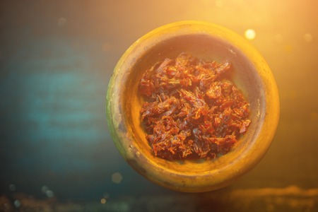 Man’s hand holding pipe with smoke in a dark background. In front blurred candle flame.