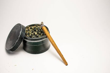 A Used Black Grinder With the Lid Off With a Lit Cannabis Cigar Leaning on Top on a White Background