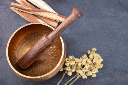 Tibetan singing copper bowl with a wooden clapper, objects for meditation and alternative medicine, top view. Plunging into a trance