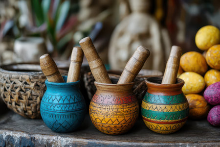 Handcrafted mortars and pestles in vibrant colors are showcased along with decorative items in a market setting emphasizing local craftsmanship.