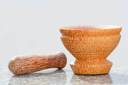 Wooden handmade mortar with pestle. Green pastel background with Bay leaves and stupa. Ingredients for the dish. Minimal concept.