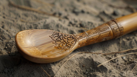 A zoomedin image of a bamboo serving s showcasing the detailed engraving on the handle. The natural color of the bamboo contrasts beautifully with the dark markings