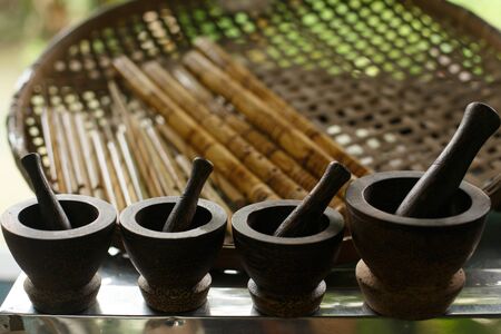 Stone mortars with pestle for grinding spices and seasonings. Dishes and cooking tools