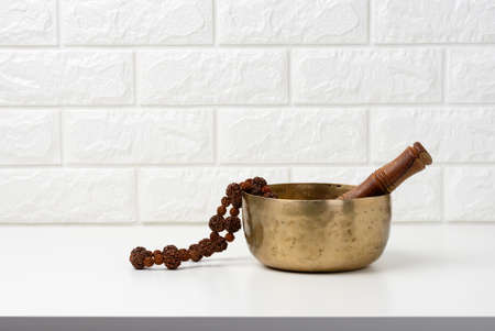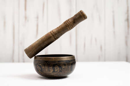 Tibetan singing copper bowl with a wooden clapper on a white wooden table, objects for meditation and alternative medicine