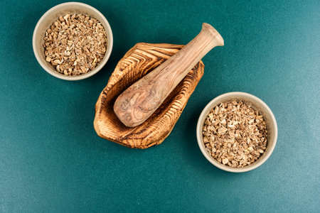 Stone mortar and pestle with different dried herbal ingredients and spices. Creative layout on dark grey background. Top view.