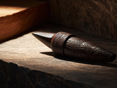 A beautifully crafted wooden pan flute resting on a rugged surface, surrounded by earthy elements, offers a glimpse into the world of traditional music and craftsmanship.