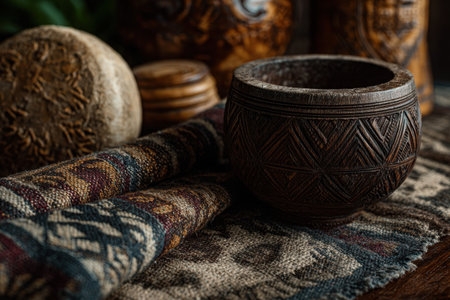 A handcrafted wooden bowl rests on a rustic table surrounded by beautifully patterned textiles, highlighting artisanal craftsmanship and cultural heritage indoors.