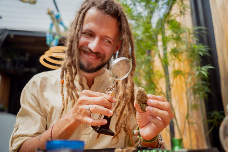 Hippie style man examines under a magnifying glass the joints and buds of medical marijuana