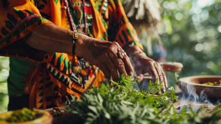 Close-up of spiritual shaman in fantasy setting guiding ayahuasca ceremony, suggesting mysticism, healing, and sacred ritual.