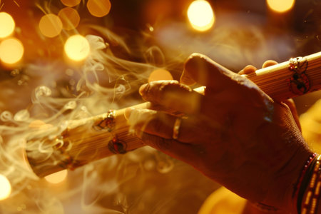 A man blows a beautifully detailed shofar, enveloped in swirling smoke, during the sacred Yom Kippur celebration, evoking deep tradition and spirituality.