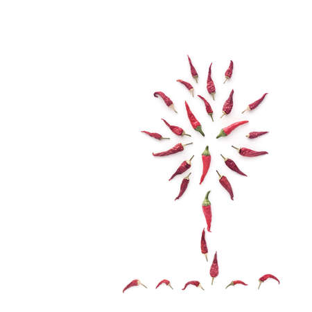 Dried chili peppers are arranged in the shape of a flower on a white background.