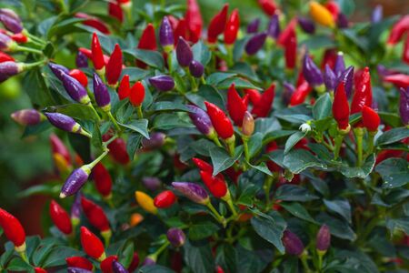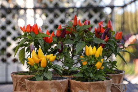Capsicum annuum plants. Many potted multicolor Chili Peppers outdoors
