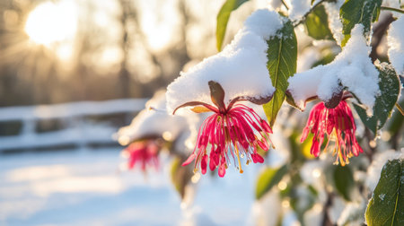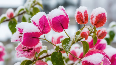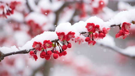 Delicate flower buds cloaked in icy crystal frost adorn a wintery branch, capturing nature's quiet resilience amidst the cold season.