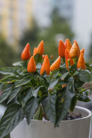 Hot colored pepper in a flower pot. Balcony flower. A green plant grown on a balcony.