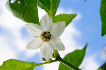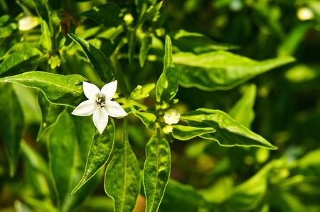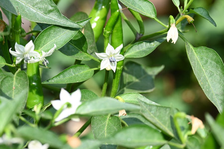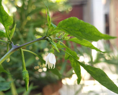 Chili plant flower. white, star-shaped flower and several unripe green chili peppers fruits and buds, surrounded by green leaves.