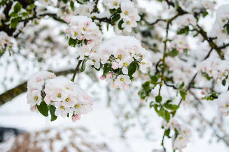 Snow covered apple tree blossoms, on an early spring day