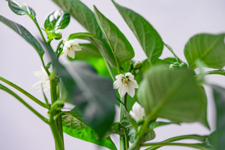 Close-Up of Pepper Plant with White Blossoms and Green Leaves