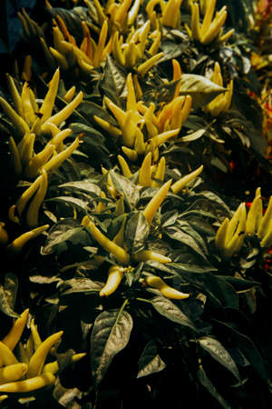 Yellow spicy peppers in the greenhouse.