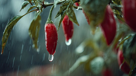 Soft rain falling gently on Chili pepper, with water droplets forming and slowly dripping. The background is softly blurred with a natural, moody atmosphere.