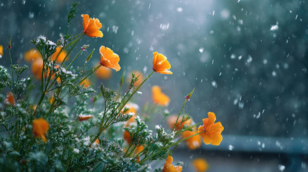 First snow falling gently on Eschscholzia, a few snowflakes drifting slowly and settling on the leaves; fresh air.