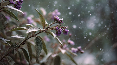 First snow falling gently on Statice, a few snowflakes drifting slowly and settling on the leaves; fresh air.